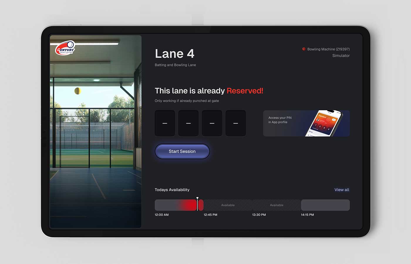 The tablet app sits at the physical centre and acts as the operational control layer. Players log in, start sessions, and connect directly to lanes and machines. The system routes sessions correctly, manages availability, and ensures smooth handoff between booking, entry, and play. Designed for shared, on-ground use, the interface prioritises legibility, feedback, and error-free operation.